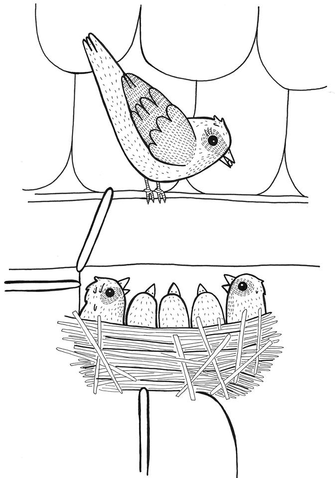 Na nic dalšího nečekali. Vyskočili z hnízda na okap, mrkli na sebe a hop! Skočit do vzduchu, zapojit křídla. Přesně jak se to učili. Mávat. Nepřestávat. Ale ono není mávat jako mávat. To musíte oběma křídly stejně, abyste se netočili dokolečka.