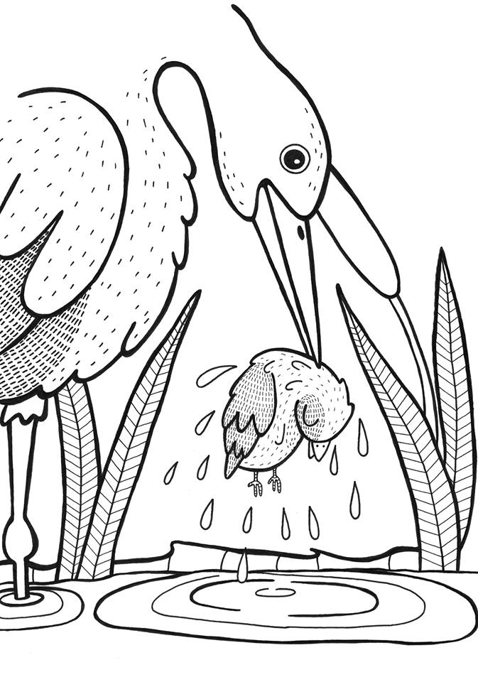 Čáp několikrát zatřásl hlavou, aby Čimčarárovi vysušil peříčka. Potom ho donesl na břeh.
