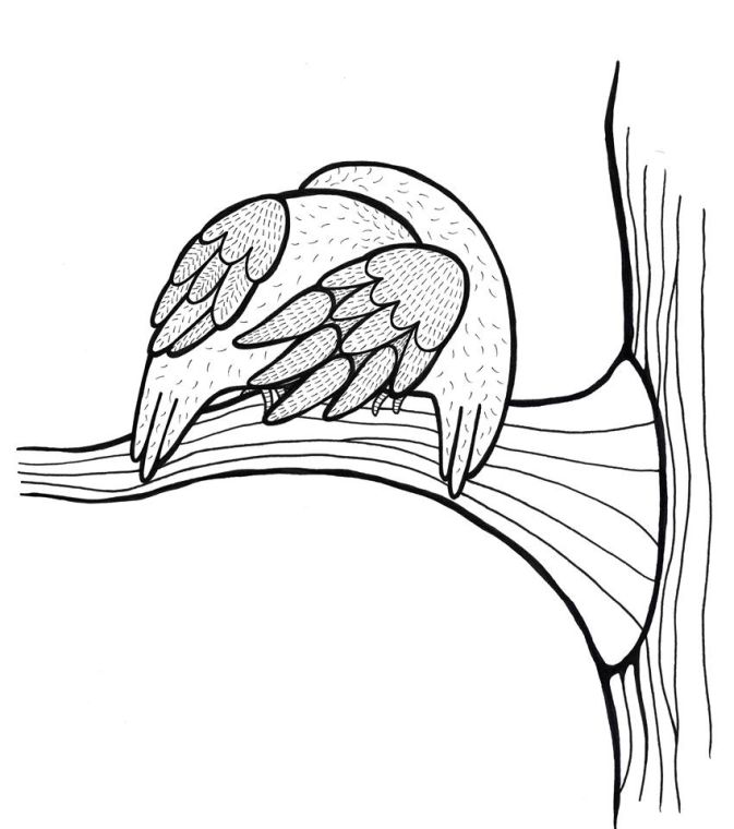 Velké zvíře k němu pomalu natočilo hlavu. Chtělo si prohlédnout, kdo ho ruší. Roztáhlo křídla. Obrovská a barevná. Pak pobaveně odpovědělo: „Já a kočka? Dejte pokoj. Copak má kočka křídla? A peří? Vy jste museli spadnout zrovna z višně.“