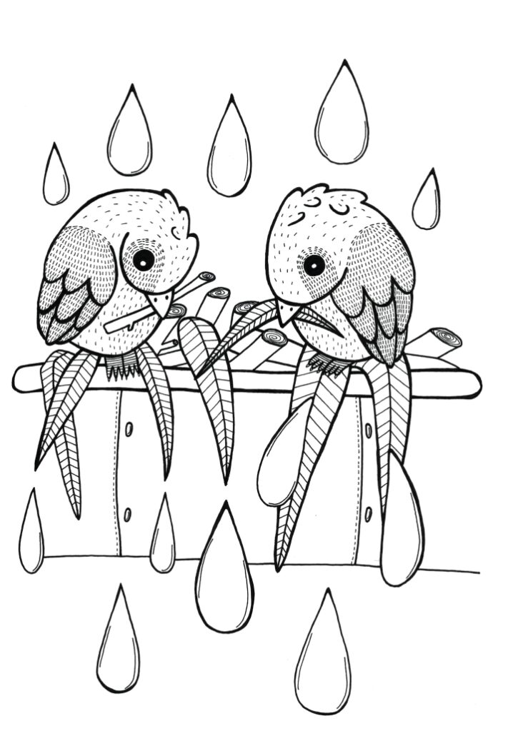 Ke slalomu mezi kapkami deště se však nedostali, všimli si totiž něčeho hodně podivného – opeřence o dost většího než oni. Stál rozkročmo přímo pod nimi a zobákem tahal něco ze země. Jakousi šňůrku. Bráškové na sebe spiklenecky mrkli a sletěli níž. Schovali se za kámen a se zájmem pozorovali, cože to ten cizí pták dělá. Netrvalo dlouho a šňůrka byla venku. Ovšem jen chvilku. Hned nato si ji totiž naládoval do zobáku. Skoro celou, koukat zůstal jen malinkatý kousíček. Nato zamával křídly a zmizel ve větvoví.
