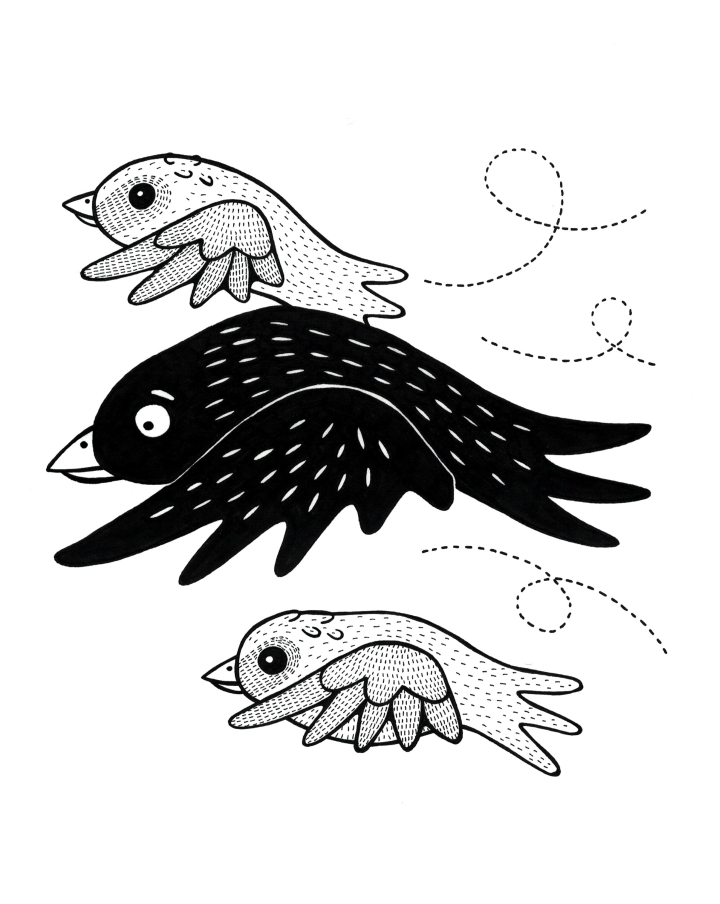 „To říkaly? Děti moje! Já jsem statečný!“ zatnul zobák, zamával křídly. Jednou, dvakrát. Odlepil se od země, nepřestával mávat a tentokrát to vyšlo! Na poslední chvíli. Kočka skočila do prázdna a natloukla si čumák.